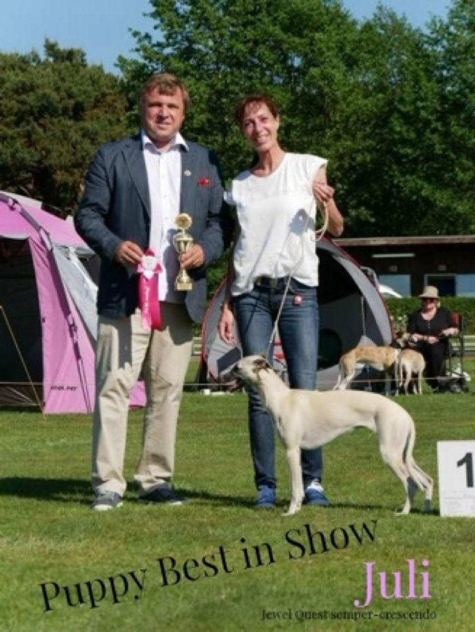 Unsere Juli- ein Sonnenschein, eine liebe Seele, ein treuherziger Schatz. Juli ist aus diesem Hause nicht mehr weg zu denken und ein Whippet, wie er im Buche steht. Zuhause extrem unkompliziert und ruhig mit dem ständigen „will-to-please-Blick“ und draußen durchaus mit Jagdtrieb und Rennfreude ausgestattet.