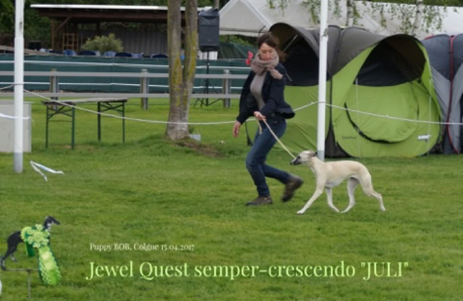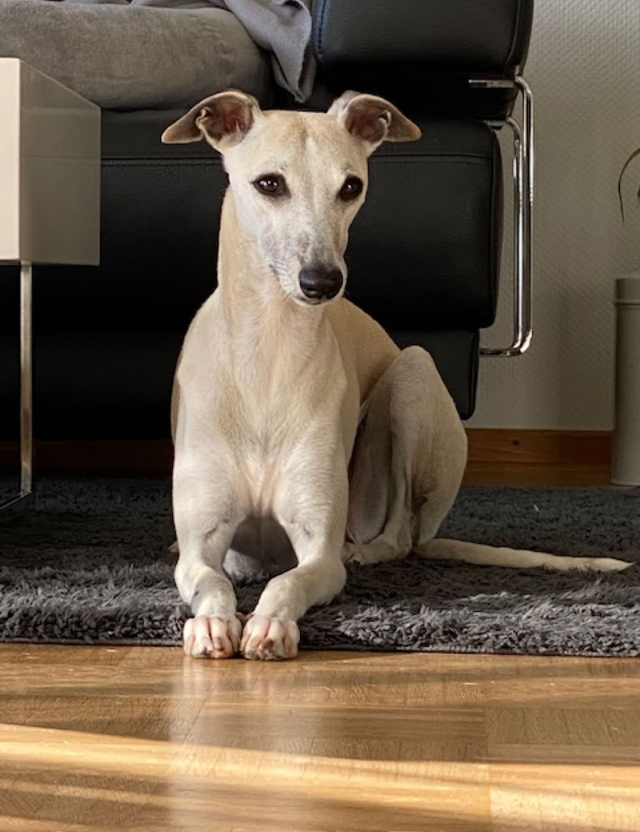 Unsere Juli- ein Sonnenschein, eine liebe Seele, ein treuherziger Schatz. Juli ist aus diesem Hause nicht mehr weg zu denken und ein Whippet, wie er im Buche steht. Zuhause extrem unkompliziert und ruhig mit dem ständigen „will-to-please-Blick“ und draußen durchaus mit Jagdtrieb und Rennfreude ausgestattet.