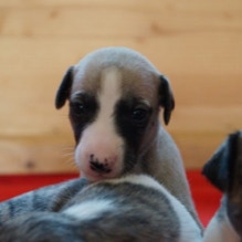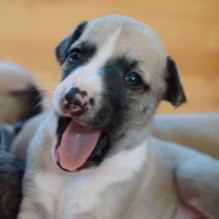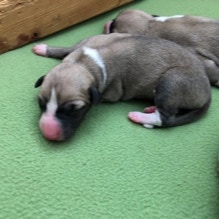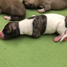 Vier Welpen sind sandfarben mit mehr oder weniger weiß, zwei Welpen sind weiß mit gestromten Platten/Mantel. Alle haben recht symmetrisch weiße Blessen. Schaut man in die Wurfkiste, so ist es ein Leichtes, die Rüden von den Hündinnen unterscheiden zu können.